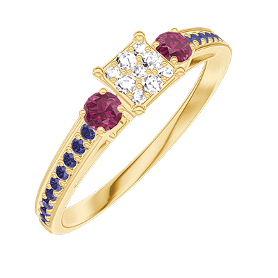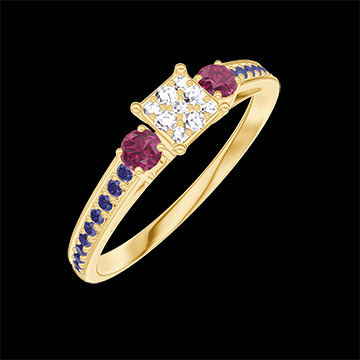 « L'ATELIER » Nº 209154Bague Or jaune 9 carats - Cluster de diamants naturels Princesse équivalent 0.3 - Pierres de côté Rubis - Sertissage Saphir bleu