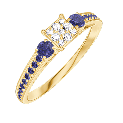 « L'ATELIER » Nº209174Bague Or jaune 9 carats - Cluster de diamants naturels Princesse équivalent 0.3 - Pierres de côté Saphir bleu - Sertissage Saphir bleu