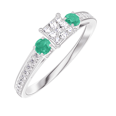« L'ATELIER » Nº 209187Bague Or blanc 18 carats - Cluster de diamants naturels Princesse équivalent 0.3 - Pierres de côté Émeraude - Sertissage Diamant