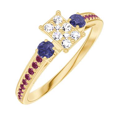 « L'ATELIER » Nº209270Bague Or jaune 9 carats - Cluster de diamants naturels Rectangle équivalent 0.3 - Pierres de côté Saphir bleu - Sertissage Rubis
