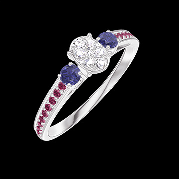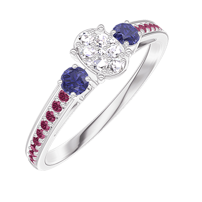« L'ATELIER » Nº 209372Bague Or blanc 9 carats - Cluster de diamants naturels Ovale équivalent 0.3 - Pierres de côté Saphir bleu - Sertissage Rubis 5