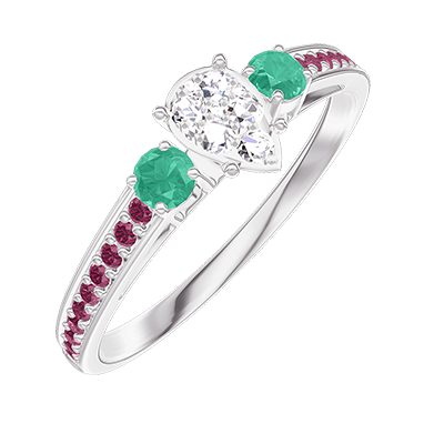 « L'ATELIER » Nº209492Bague Or blanc 9 carats - Cluster de diamants naturels Poire équivalent 0.3 - Pierres de côté Émeraude - Sertissage Rubis