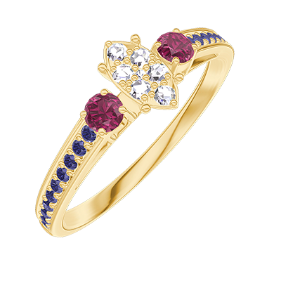 « L'ATELIER » Nº209554Bague Or jaune 9 carats - Cluster de diamants naturels Marquise équivalent 0.3 - Pierres de côté Rubis - Sertissage Saphir bleu