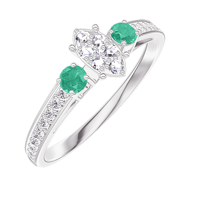 « L'ATELIER » Nº 209587Bague Or blanc 18 carats - Cluster de diamants naturels Marquise équivalent 0.3 - Pierres de côté Émeraude - Sertissage Diamant