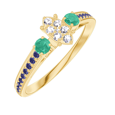 « L'ATELIER » Nº209593Bague Or jaune 18 carats - Cluster de diamants naturels Marquise équivalent 0.3 - Pierres de côté Émeraude - Sertissage Saphir bleu