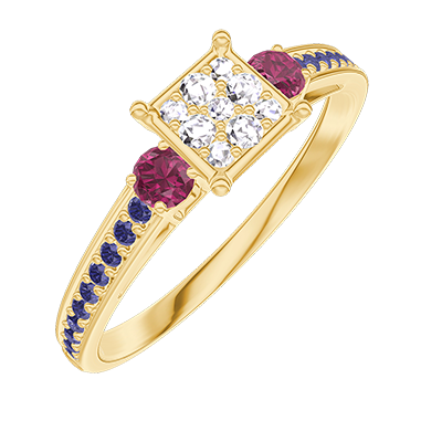 « L'ATELIER » Nº 209754Bague Or jaune 9 carats - Cluster de diamants naturels Princesse équivalent 0.5 - Pierres de côté Rubis - Sertissage Saphir bleu