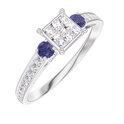 « L'ATELIER » Nº 209767Bague Or blanc 18 carats - Cluster de diamants naturels Princesse équivalent 0.5 - Pierres de côté Saphir bleu - Sertissage Diamant