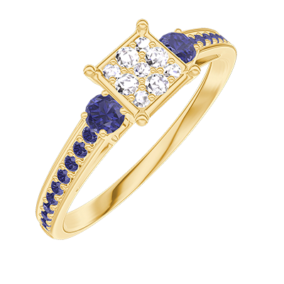 « L'ATELIER » Nº209774Bague Or jaune 9 carats - Cluster de diamants naturels Princesse équivalent 0.5 - Pierres de côté Saphir bleu - Sertissage Saphir bleu