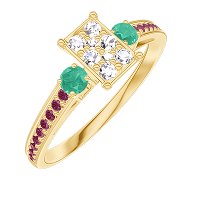 « L'ATELIER » Nº 209890Bague Or jaune 9 carats - Cluster de diamants naturels Rectangle équivalent 0.5 - Pierres de côté Émeraude - Sertissage Rubis