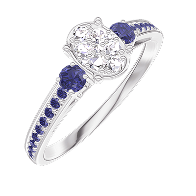 Bague Or blanc 18 carats - Cluster de diamants naturels Ovale équivalent 0.5 - Pierres de côté Saphir bleu - Sertissage Saphir bleu