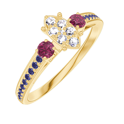 « L'ATELIER » Nº210154Bague Or jaune 9 carats - Cluster de diamants naturels Marquise équivalent 0.5 - Pierres de côté Rubis - Sertissage Saphir bleu