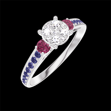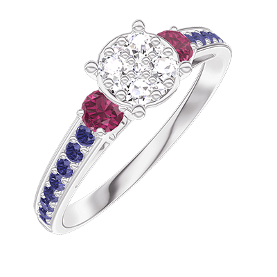 « L'ATELIER » Nº 210256Bague Or blanc 9 carats - Cluster de diamants naturels Rond équivalent 0.7 - Pierres de côté Rubis - Sertissage Saphir bleu 4.9