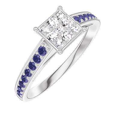 « L'ATELIER » Nº210316Bague Or blanc 9 carats - Cluster de diamants naturels Princesse équivalent 0.7 - Sertissage Saphir bleu