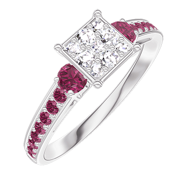« L'ATELIER » Nº210352Bague Or blanc 9 carats - Cluster de diamants naturels Princesse équivalent 0.7 - Pierres de côté Rubis - Sertissage Rubis