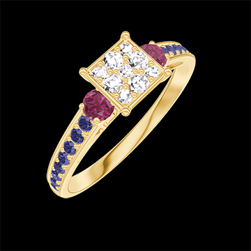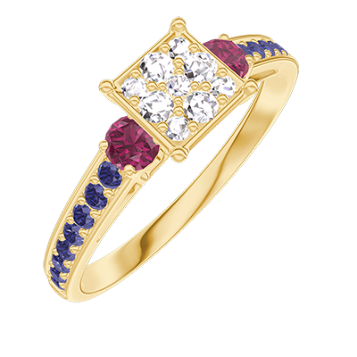 « L'ATELIER » Nº 210354Bague Or jaune 9 carats - Cluster de diamants naturels Princesse équivalent 0.7 - Pierres de côté Rubis - Sertissage Saphir bleu