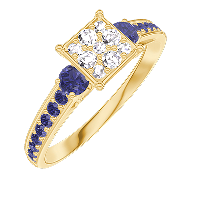 « L'ATELIER » Nº210373Bague Or jaune 18 carats - Cluster de diamants naturels Princesse équivalent 0.7 - Pierres de côté Saphir bleu - Sertissage Saphir bleu