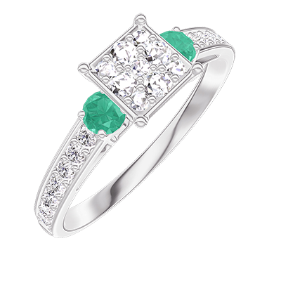 « L'ATELIER » Nº 210387Bague Or blanc 18 carats - Cluster de diamants naturels Princesse équivalent 0.7 - Pierres de côté Émeraude - Sertissage Diamant
