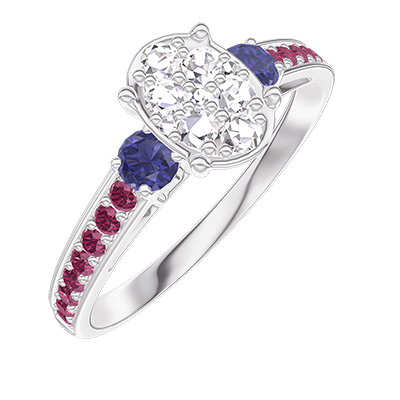 Bague Or blanc 18 carats - Cluster de diamants naturels Ovale équivalent 0.7 - Pierres de côté Saphir bleu - Sertissage Rubis
