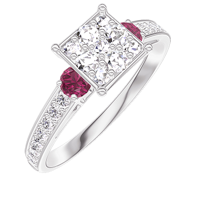 « L'ATELIER » Nº 210947Bague Or blanc 18 carats - Cluster de diamants naturels Princesse équivalent 1 - Pierres de côté Rubis - Sertissage Diamant