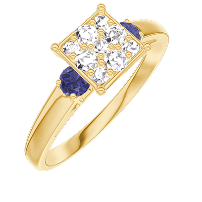 « L'ATELIER » Nº 210962Bague Or jaune 9 carats - Cluster de diamants naturels Princesse équivalent 1 - Pierres de côté Saphir bleu