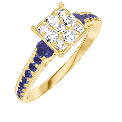 « L'ATELIER » Nº210974Bague Or jaune 9 carats - Cluster de diamants naturels Princesse équivalent 1 - Pierres de côté Saphir bleu - Sertissage Saphir bleu