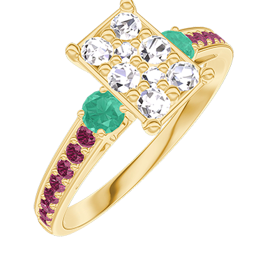 Bague Or jaune 9 carats - Cluster de diamants naturels Rectangle équivalent 1 - Pierres de côté Émeraude - Sertissage Rubis
