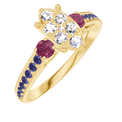 « L'ATELIER » Nº211354Bague Or jaune 9 carats - Cluster de diamants naturels Marquise équivalent 1 - Pierres de côté Rubis - Sertissage Saphir bleu