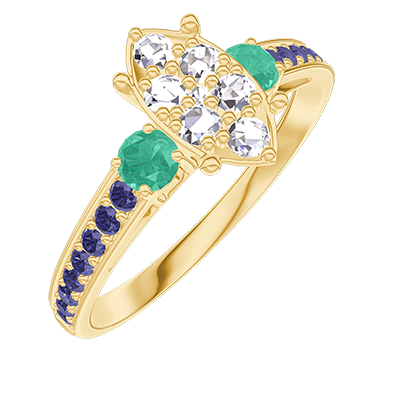« L'ATELIER » Nº211393Bague Or jaune 18 carats - Cluster de diamants naturels Marquise équivalent 1 - Pierres de côté Émeraude - Sertissage Saphir bleu