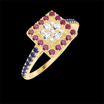 « L'ATELIER » Nº211478Bague Or jaune 9 carats - Cluster de diamants naturels Princesse équivalent 0.5 - Halo Rubis - Sertissage Saphir bleu 4.1 (10)