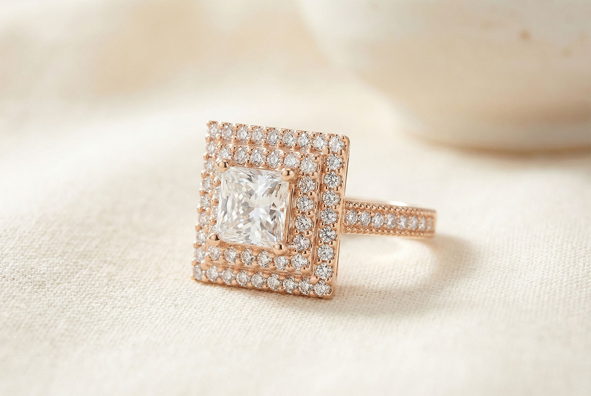 « L'ATELIER » Nº 413420Bague Or rose 18 carats - Diamant synthétique Princesse 0.5 carat - Halo Diamant synthétique - Sertissage Diamant synthétique