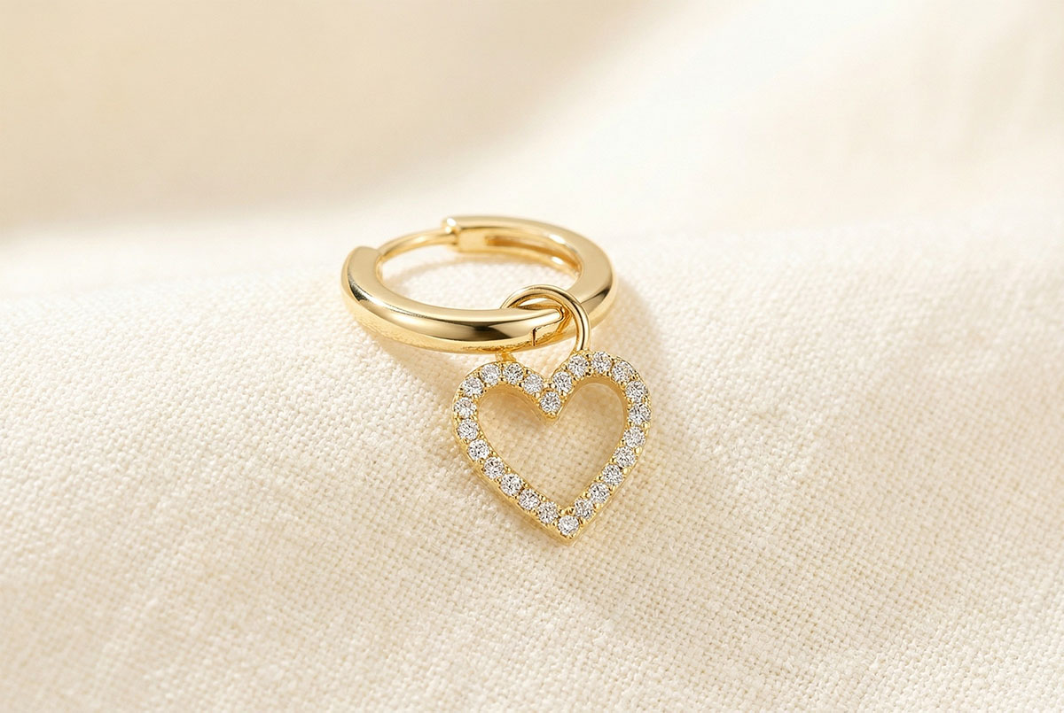 Une créole à l'unité parée de sa breloque or jaune en forme de coeur et pavée de diamants étincelants. Dimensions anneau breloque de 3,1mm de diamètre.