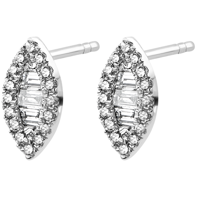 Une trilogie de diamants baguette, souligné d'un pavage en amande, pour un paire de boucles d'oreilles fine et féminine, aux formes inspirées des contes d'orient.