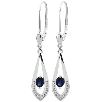 Des boucles d'oreilles pendantes classiques et féminines. Dimensions saphir: 4x3mm. 2 diamants : 0.01 carat - Or blanc (9 carats = 375/1000): 1.3 g. Saphir bleu : 2 - Total: 0.45 caratPlus dimensions