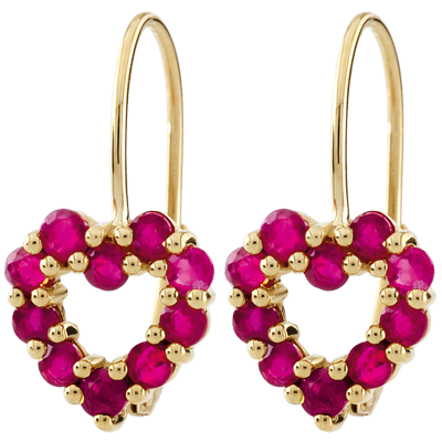 Deux coeurs précieux faits de rubis et griffés d'or jaune sont les parfaits alliés de votre féminité. Modèle dormeuses. Or jaune (9 carats = 375/1000): 1 g. Rubis : 20 - Total: 1.24 carat Plus dimensions