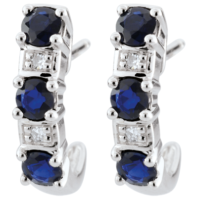 Des demi-créoles classiques et intemporelles, mêlant l'or, le diamant et le précieux saphir. 4 diamants : 0.02 carat - Or blanc (9 carats = 375/1000): 1.1 g. Saphir bleu : 6 - Total: 0.58 carat Plus dimensions