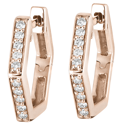 Une paire de créoles or rose hexagonales serties de délicats diamants pour un effet graphique et moderne à la fois. Bijou fort de personnalité.