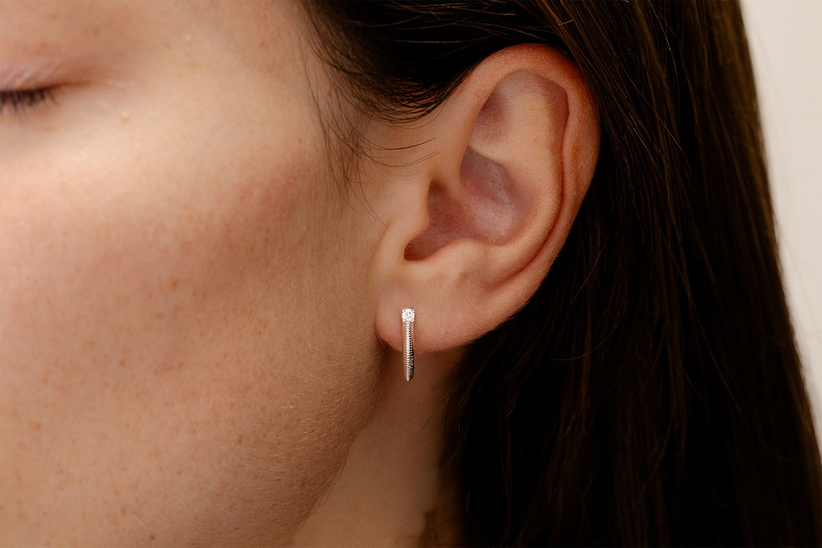 Un diamant solitaire maintenu par 4 griffes et posé sur une précieuse créoles d'or travaillé. Une paire de boucles d'oreilles originale et intemporelle. 2 diamants : 0.08 carat - Or blanc (18 carats = 750/-): 2.5 g.Plus dimensions