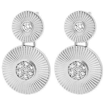 Une paire de boucles d'oreilles pendantes en or blanc, évoquant le soleil par leur design rayonnant, et illuminées au centre par un cluster de diamants sertis. Une interprétation moderne de l'opulence, parfaite pour irradier de lumière toute tenue au quotidien. 16 diamants : 0.41 carat - Or blanc (18 carats = 750/-): 4.6 g.Plus dimensions