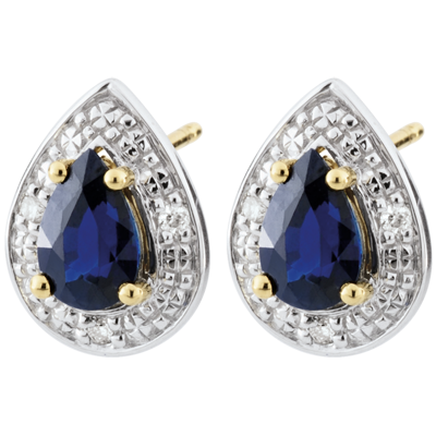 Deux gouttes de saphirs cristalisées dans un écrin de diamants et d'or. Sublime classique de féminité. 6 diamants : 0.04 carat - Or blanc (9 carats = 375/1000): 1 g. Saphir bleu : 2 - Total: 1.03 carat Plus dimensions