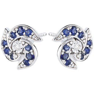 Un duo de tourbillons précieux, étincellant de diamants et saphirs. 2 diamants : 0.02 carat - Or blanc (9 carats = 375/1000): 0.9 g. Saphir bleu : 18 - Total: 0.32 carat Plus dimensions