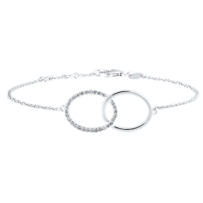 Tels des rubans, les cercles d'or blanc sont enchevêtrés tout en souplesse. Un cercle tout or et un cercle or et diamants.