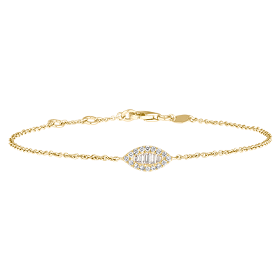 Un bracelet fin et féminin aux formes inspirées des contes d'Orient. Le motif de cinq diamants baguette est délicatement souligné d'un pavage diamant en amande et monté sur chaînette or jaune. Bracelet de longueur réglable : 18cm, 17cm, 16cm. 21 diamants : 0.21 carat - Or jaune (9 carats = 375/1000): 1.4 g.Plus dimensions