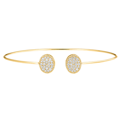 L'éclat iridescent de deux pavés diamants minutieux et raffinés sur un bracelet jonc or jaune délicat.