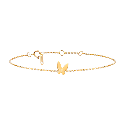 Un papillon délicatement posé au poignet, symbole de liberté et de douceur.Un bracelet tout en grâce et légèreté, comme un souffle d’été. Or jaune (9 carats = 375/1000): 0.4 g. Plus dimensions