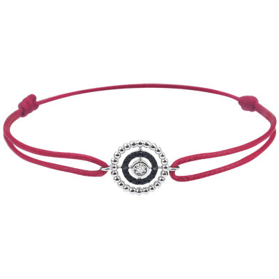 Un cercle de perles d'or entoure un cercle de diamants et un solitaire en son centre. Le motif est monté sur un cordon rouge moderne. Bracelet de longueur réglable: 18cm, 17cm, 16cm. Motif de 11mm longueur et 11mm de hauteur. 1 diamant : 0.01 carat - Or blanc (9 carats = 375/1000): 0.8 g. Diamant : 1 - Diamant noir : 4 - Total: 0.016 carat Plus dimensions