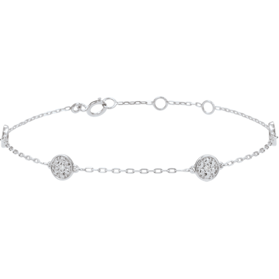 Quatre motifs en or blanc travaillés façon diamant donnent aux diamants centraux tout leur éclat tels des étoiles. Un bracelet Myriade élégant et féminin.Bracelet de longueur réglable: 18cm, 17cm, 16cm.Motif de 5mm longueur et 5mm de hauteur. 4 diamants : 0.03 carat - Or blanc (9 carats = 375/1000): 1.3 g. Plus dimensions