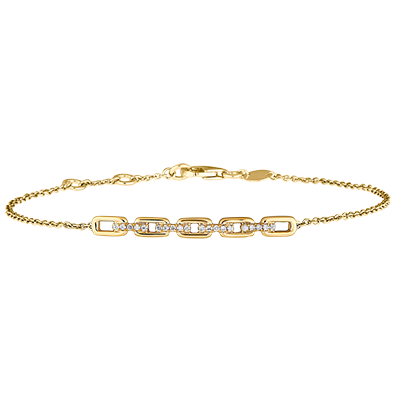 Cinq généreux maillons cubains sertis de diamants contrastent avec une délicate chaînette pour un bracelet or jaune classique revisité. Bracelet de longueur réglable : 18cm, 17cm, 16cm. 20 diamants : 0.08 carat - Or jaune (18 carats = 750/-): 2.6 g. Plus dimensions