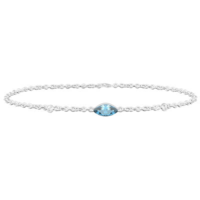 La précieuse pupille symbolisée par une navette de topaze bleue trone au centre de cette fine chaine d'or blanc. Elle est entourée par deux sublimes diamants telles deux larmes figées à jamais. Un bracelet pétillant et précieux à porter avec toutes vos tenues. Dimensions pierre centrale : longueur: 5mm - largeur: 2.4mm. 2 diamants : 0.03 carat. 2 diamants : 0.03 carat - Or blanc (9 carats = 375/1000): 1.3 g. Topaze bleue : 1 - Diamant : 2 - Total: 0.19 carat Plus dimensions