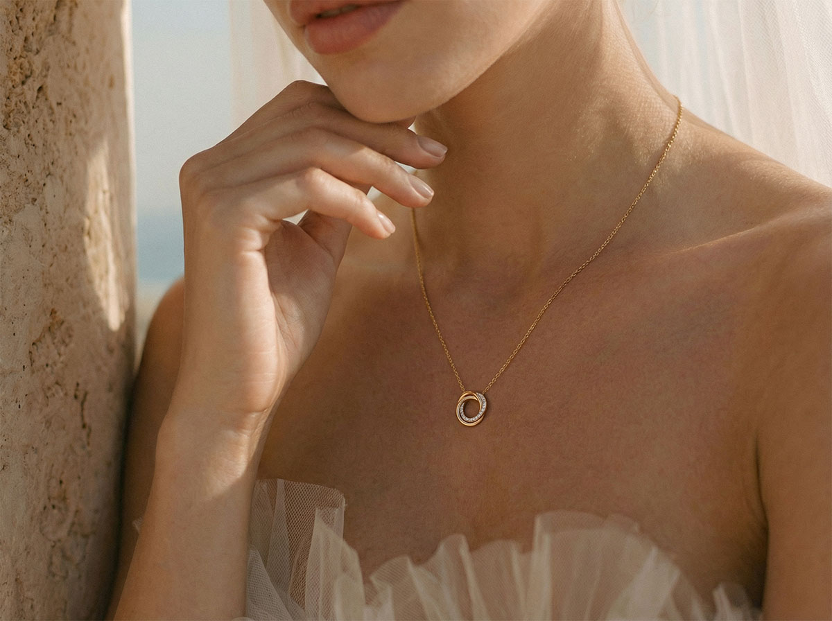 Ce bijou suspendu à une chaîne en or 9 carats de longueur ajustable (42-45 cm) incarne un design intemporel inspiré par la danse hypnotique des anneaux de Saturne.