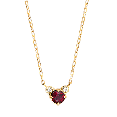 Un rubis rehaussé par deux diamants éclatants, compose un trio lumineux au charme délicat, formant une silhouette subtile de cœur.Une création fine et féminine, comme un éclat de tendresse suspendu à votre cou. Avec chaîne avec double position 42cm et 45cm en or 9 carats. Or jaune (9 carats = 375/1000): 1.3 g. Rubis synthétique : 1 - Diamant synthétique : 2 - Total: 0.17 carat Plus dimensions